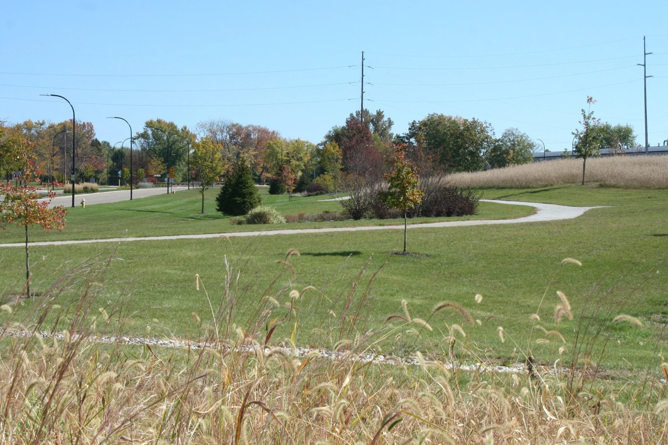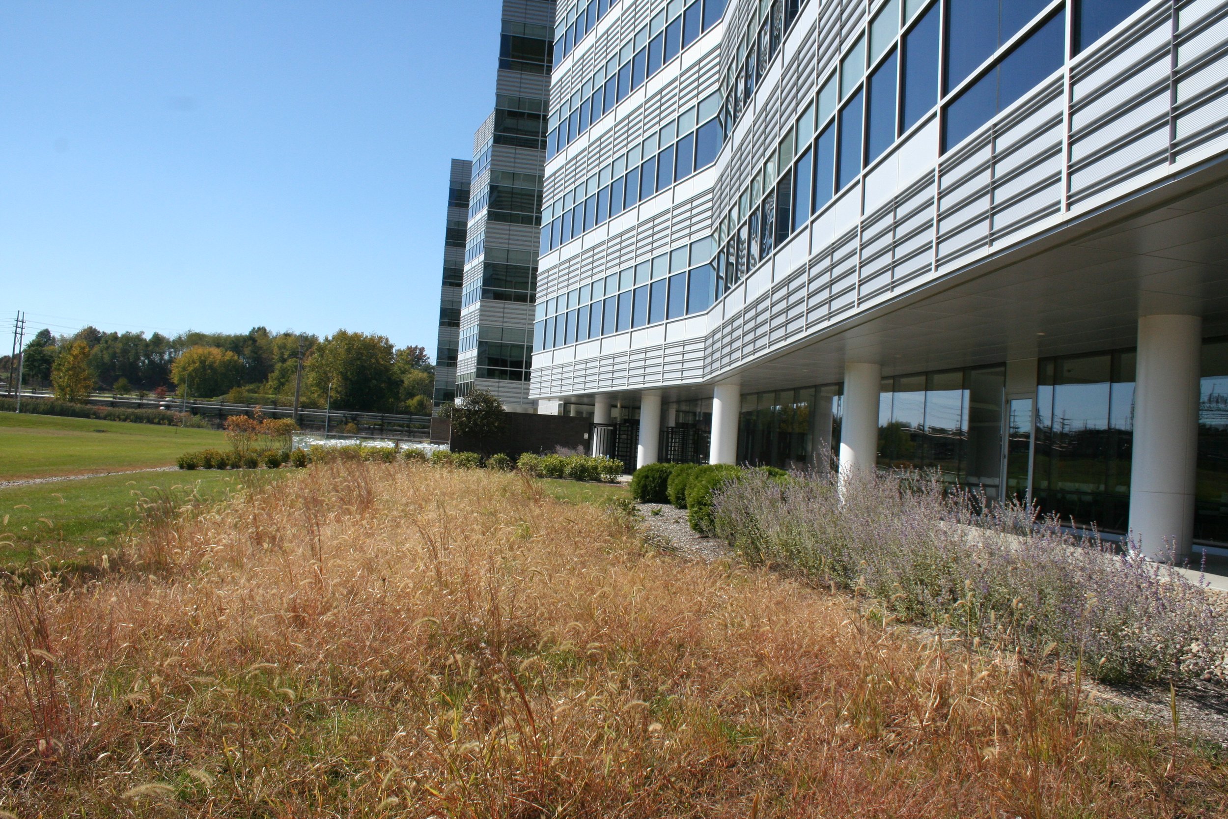 Two green roofs, rain gardens, pervious pavement, native plantings, and a 7-acre native prairie grass meadow all contributed to the project’s LEED Gold certification.